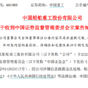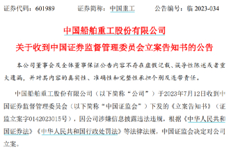 7月12日晚间,中国重工发布公告称,公司当日收到中国证监会下发的《立案告知书》(证监立案字0142023015号)。因公司涉嫌信息披露违法违规,根据相关法律法规,中国证监会决定对公司立案。