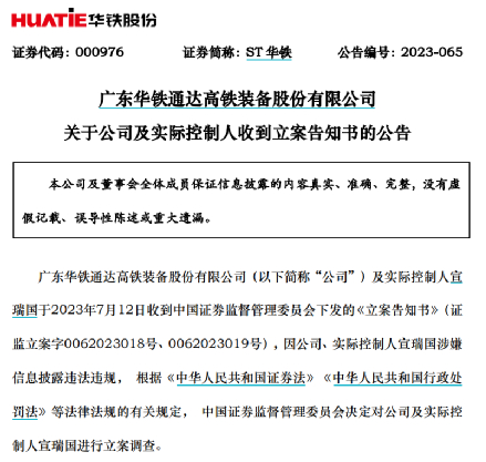 ST华铁:公司及实控人遭立案