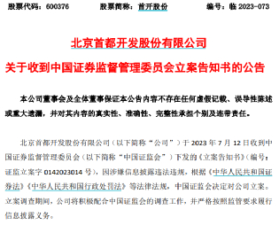 首开股份公告称,公司于7月12日收到中国证监会下发的《立案告知书》(编号:证监立案字0142023014号)。因涉嫌信息披露违法违规,根据相关法律法规,中国证监会决定对公司立案。