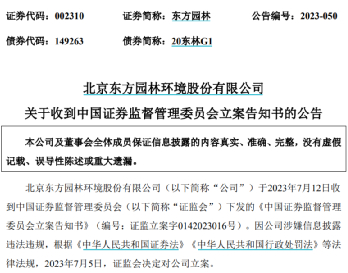 东方园林发布公告称,公司于7月12日收到中国证监会下发的《立案告知书》(编号:证监立案字0142023016号)。因涉嫌信息披露违法违规,根据相关法律法规,中国证监会决定对公司立案。