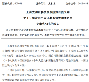 太和水发布公告称,公司于7月12日收到中国证监会下发的《立案告知书》(编号:证监立案字0032023035号)。因涉嫌信息披露违法违规,根据相关法律法规,中国证监会决定对公司立案。