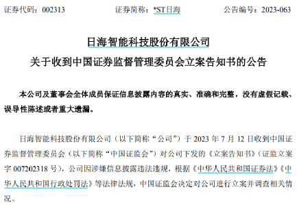 *ST日海发布公告称,公司于7月12日收到中国证监会下发的《立案告知书》(证监立案字007202318号)。因涉嫌信息披露违法违规,根据相关法律法规,中国证监会决定对公司立案。