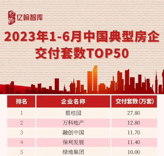 亿翰智库今年6月底发布了《2023年1-6月中国典型房企交付业绩研究报告》,TOP50房企今年上半年总交付数约为202.58万套,其中碧桂园以27.8万套的交付数位列榜单第一名,占了TOP50房企交付量的13.7%。