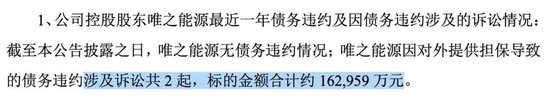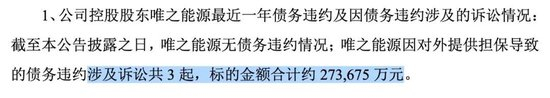 值得注意的是,7月13日的这份公告中显示,唯之能源因对外提供担保导致的债务违约涉及诉讼共3起,标的金额合计约27.37亿元。