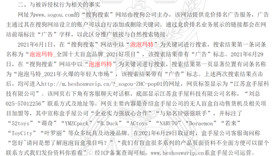 2021年,有网友在搜狗搜索网站中以“泡泡玛特”为关键词进行搜索,结果显示的第一个词条为“泡泡玛特全国十大盲盒品牌2021好项目”,且带有“广告”标志,点进去显示为“江苏盒手屋科技有限公司”。