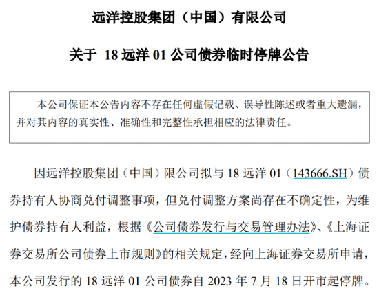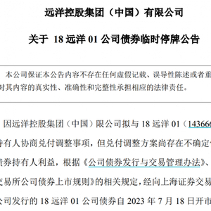 18日早间,远洋集团宣布拟与“18远洋01”债券持有人协商兑付调整事项,但兑付调整方案尚存在不确定性,因此申请该债券临时停牌。