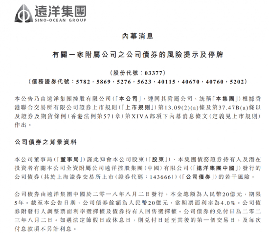随后有市场消息称,债券停牌后,持有人组建一个持有人小组,已经凑齐10%的份额,要求远洋集团召开持有人临时会议,同时要求远洋集团能履行股东责任,按期兑付债券的本息。