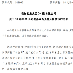 这笔20亿的公司债即将在8月2日到期,简称“18远洋01”,是远洋控股于2018年8月2日发行的远洋地产有限公司公开发行 2018 年公司债券,期限5年,当期票面利率4.0%,应于2023年8月2日支付本金余额及应付利息。