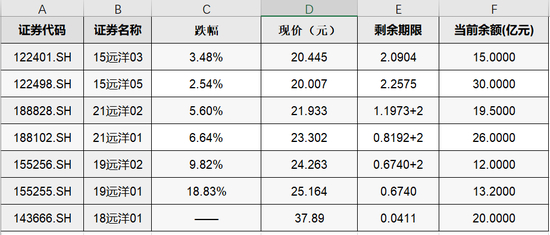 受此影响,远洋控股其他6只公司债连续两日下跌,截至7月18日,现价已经集体跌至30元以下。其中,“15远洋05”价格最低,仅约20元;“19远洋01”盘中跌幅最大,一度引发临时停牌,盘中最低价格仅24.2元。