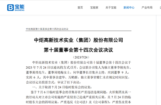 上述决议称,独立董事李刚、董事黄炜、董事周艳梅,何华董事长召集了此次会议,于7月24日以通讯的方式召开,应到董事9人,实到6人。会议审议通过了关于取消7月24日临时股东会的议案、关于由秦君雪代为行使总经理职能的议案、关于敦促管理层梳理与中国证监会广东分局、上海交易所的沟通情况并恳请中国证监会、中国证监会广东分局、上海交易所介入调查的议案。