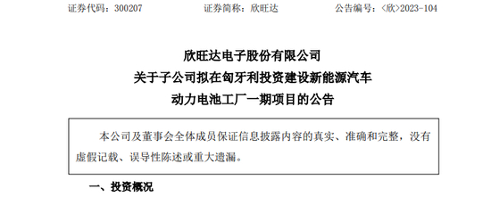 7月27日晚间,欣旺达(300207)公告称,公司子公司欣旺达动力通过其下属子公司匈牙利欣旺达,以自有及自筹资金在匈牙利投资建设新能源汽车动力电池工厂一期项目,投资金额不超过19.6亿元。