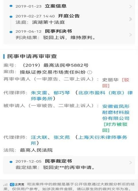 2018年11月16日,安徽省高级人民法院审理一审驳回投资者史丽华的诉讼请求。野马财经查看案件最新进展,截至2019年12月5日,经最高人民法院审理认为,两位投资者史丽华、董洪勤的上诉理由均不能成立,其上诉请求应予驳回。