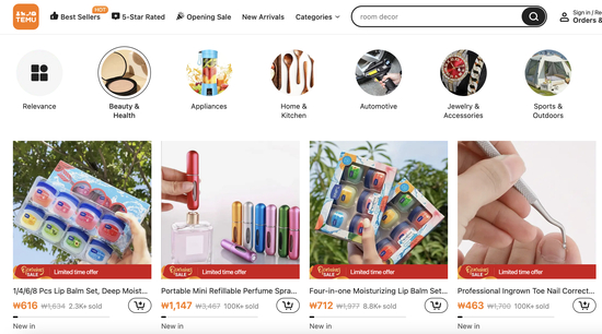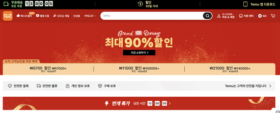 打开Temu刚刚上线的韩国站,首页置顶跳动的字符直接告诉用户——已经“砍”掉了商品原价的90%。在这里,你可以用500韩元(约2.8元)左右的价格买一个针线包,也可以花不到2万韩元(约110元)买一个空调扇。
