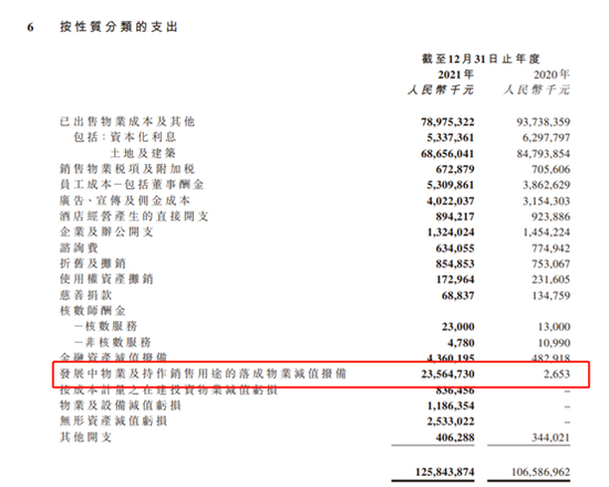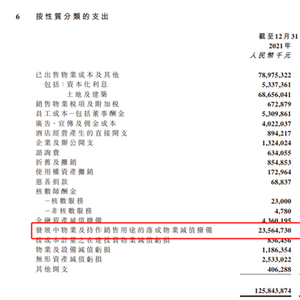 可以发现的是,世茂2021年的营收较2020年同期下降不多,但归母净利润却同比下滑了314.55%,由盈转亏。除了毛利大幅减少外,还有一个重要原因便是落成物业的计提减值。