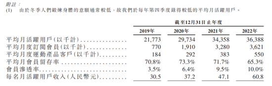 招股书显示,2020年,Keep的平均月活跃用户为2970万,增速达到36%。此后,Keep的平均月活跃用户整体也在保持增长,2021年为3440万,2022年为3639万。