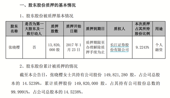 接下来的时间里,张晓樱在纳川股份的持股就不断地经历质押、解质押、再质押的循环,质权人则包括东方证券、长江证券、广发证券等诸多机构,用途多为个人融资。最多时,张晓樱质押的股份一度占到持股总数的99.99%。
