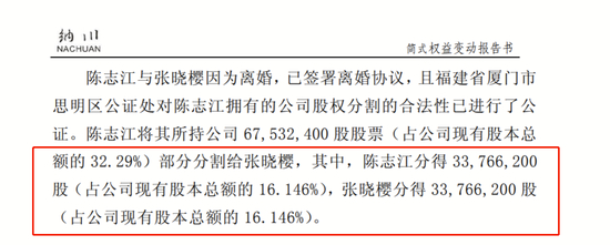 2013年8月,纳川股份发布公告称,纳川股份时任董事长兼实控人陈志江与妻子张晓樱离婚,其持有的股权被一分为二。