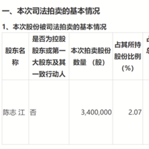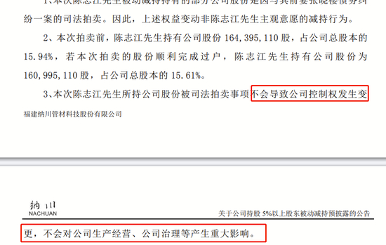 拍卖前,陈志江持有纳川股份1.64亿股股份,占公司总股本的15.94%,为第一大股东。交易完成后,陈志江的持股数量降至1.61亿股股份,占总股本的15.61%。
