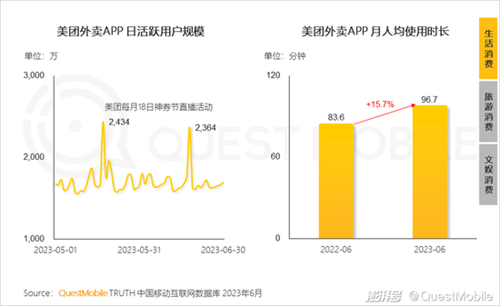 QuestMobile数据显示,今年5月、6月神券节当天,美团外卖App日活跃用户规模均突破两千万。