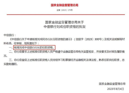 同日,国家金融监督管理总局发布任职资格批复消息显示,已核准刘成中信银行行长的任职资格。
