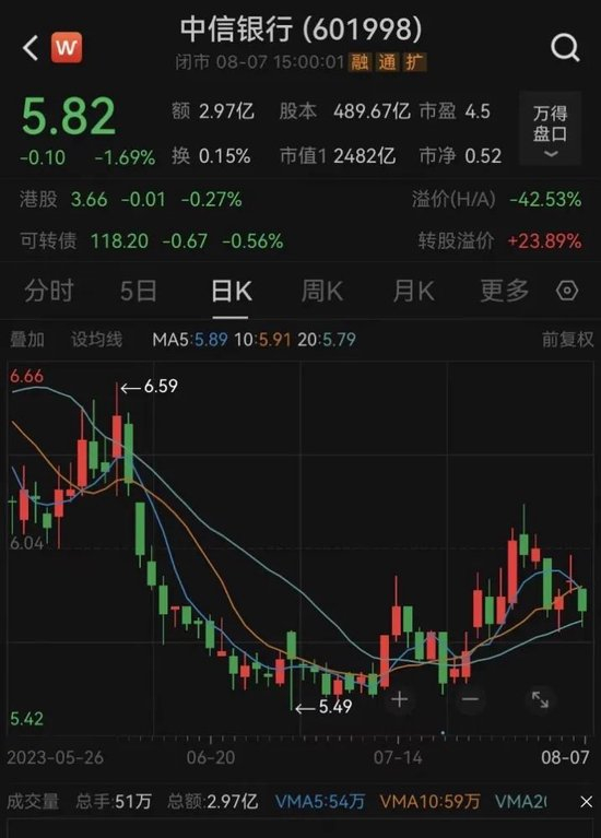 股价方面,截至8月7日收盘,中信银行每股报5.82元,年内涨幅超16%,最新市值为2482亿元。