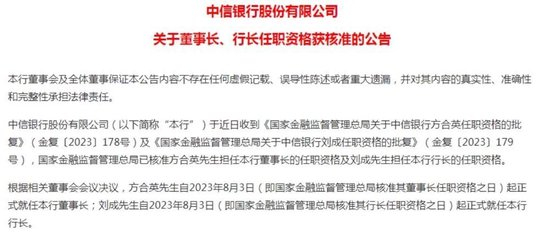 8月7日,中信银行发布公告称,已于近日收到国家金融监督管理总局下发的任职资格批复,核准方合英中信银行董事长的任职资格、核准刘成中信银行行长的任职资格。二人均自8月3日起正式就任。