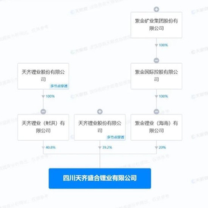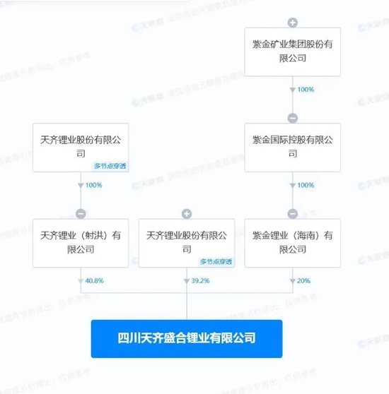 天眼查数据显示,盛合锂业是天齐锂业旗下的公司,其经营范围含锂矿、铍矿、铌矿、钽矿的采掘、加工和销售。股份变更前,天齐锂业及其全资子公司天齐锂业(射洪)有限公司,分别持有盛合锂业49%、51%的股权。天眼查股权穿透图显示,股份变更后,紫金矿业持有盛合锂业20%的股权,其余80%的股权由天齐锂业直接或间接持有。