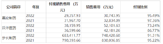 因此,自建销售队伍的直接成本和管理成本或许不是关注的重点。从销售费用的结构来看,2022年嘉应制药支付的付现销售费用发生额为2.93亿元,占当期销售费用总额的95.49%,高于同行业企业水平。