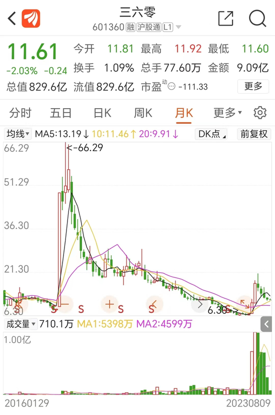 截至8月9日收盘,三六零股价为11.61元,市值约830亿。