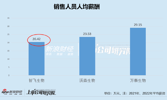 这薪资水平与同行沃森生物、万泰生物等是否存在差异呢?我们发现,智飞生物2021年与2022年销售人员人均薪酬为20.42万元,而沃森生物为23.53万元、万泰生物为29.15万元。