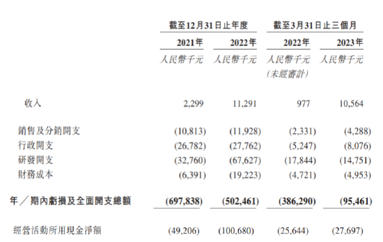 首先,公司2021年-2023年三月的业绩表现均为亏损,报告期内累计亏损约13亿元,累计营收额仅为2415万元,尚不及同期累计销售费用。