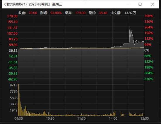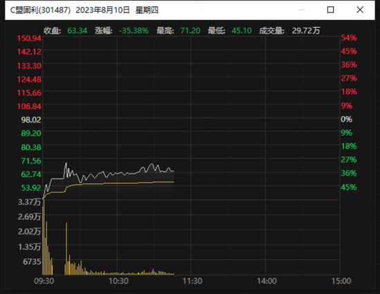 2023年8月9日,是盟固利(301487.SZ)上市首日,大概也是其成立以来最高光的时刻:当日午后开盘,盟固利股价突然飙涨,从40元附近突然大涨并多次震荡回落,最高时一度超200元,全天换手率高达84%。