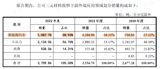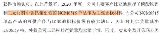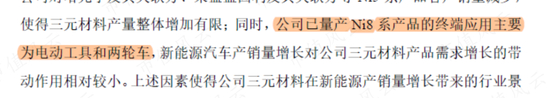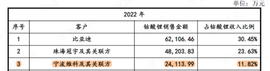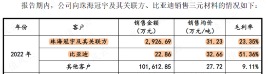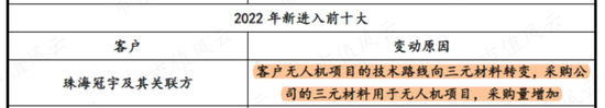 对于第二大客户珠海冠宇,合作也主要来自钴酸锂。向其销售的2926.69万元三元材料,是用于无人机项目,与新能源汽车无关。