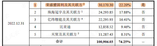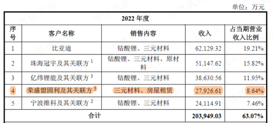 2022年的前五大客户,除了荣盛盟固利,比亚迪、珠海冠宇、亿纬锂能、宁波维科都是能叫得上名的,且合作内容均包含钴酸锂、三元材料。