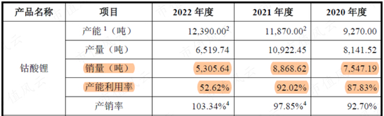 而这期间,其钴酸锂产能却从9270吨扩大至12370吨,产能利用率从87.83%下滑至52.62%,新建的产能明显都闲置了。