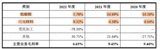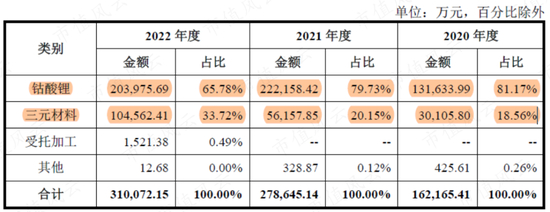 2020-2022年,钴酸锂、三元材料两大产品的收入,几乎贡献了全部的收入。相比来看,钴酸锂的收入占据更主要地位。