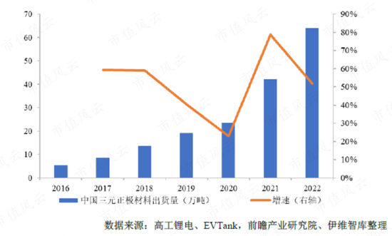 与钴酸锂不同,三元正极材料这个正在成长中的行业,市场空间快速增长,从2016年的5.4万吨扩大至2022年的64万吨。