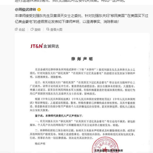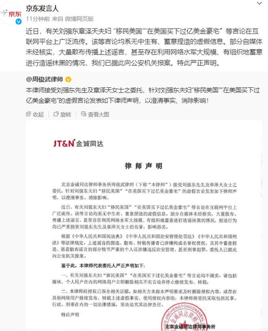 稍早之前,北京金诚同达律师事务所周俊武律师接受刘强东及章泽天的委托,针对刘强东夫妇“移民美国”“在美国买下过亿美金豪宅”的虚假言论发表律师声明,以澄清事实、消除影响。