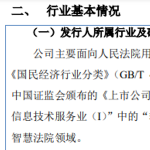 招股书显示,华夏电通主要面向法院用户提供自主研发的行业软件产品和解决方案。根据《国民经济行业分类》(GB/T 4754-2017),公司所属行业为“软件和信息技术服务业(I65)”。根据中国证监会颁布的《上市公司行业分类指引》(2012 年修订),公司所属行业为“信息传输、软件和信息技术服务业(I)”中的“软件和信息技术服务业(I65)”。公司所处细分行业为电子政务板块的智慧法院领域。