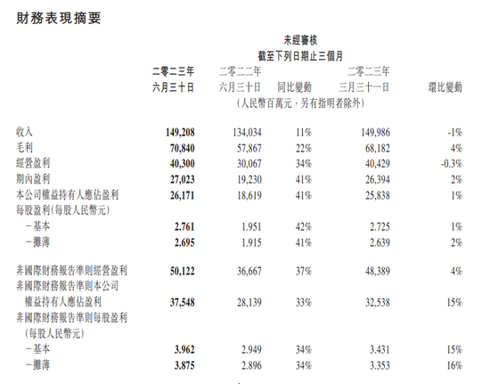 这个数据貌似不及市场预期。市场预估的营收是1519.5亿元人民币,净利润预估的是323.4亿元人民币;不过非国际财务报告准则下净利润则好于预估的362.6亿元人民币。