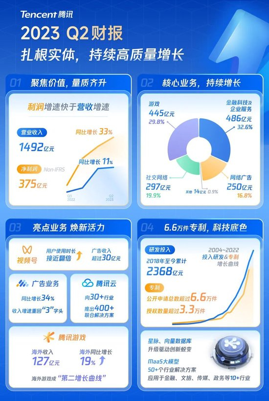 2023年腾讯二季度营收为1492亿元,同比增长11%,净利润261.7亿元,同比增长41%;非国际财务报告准则下的净利润为375.48亿元,同比增长33%。