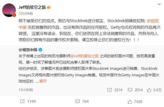 针对视觉中国的声明,戴建峰8月16日早上回应,表示自己已经跟Stocktrek Images核实:“Stocktrek明确告知我,视觉中国无权销售我的作品,也没有我作品的任何版权。Getty也无权将我的作品再次转授。”