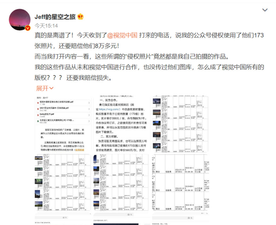 戴建峰回应,称视觉中国无权销售其作品。(图/微博@Jeff的星空之旅)