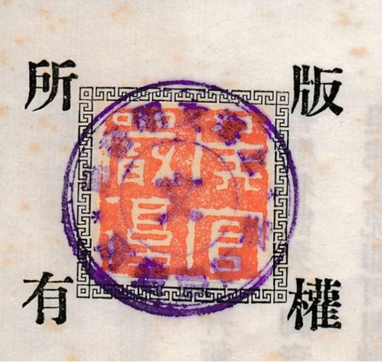 1903年6月《群学肄言》第一版,严复的印花上加盖文明书局印章,四周写“版权所有”。