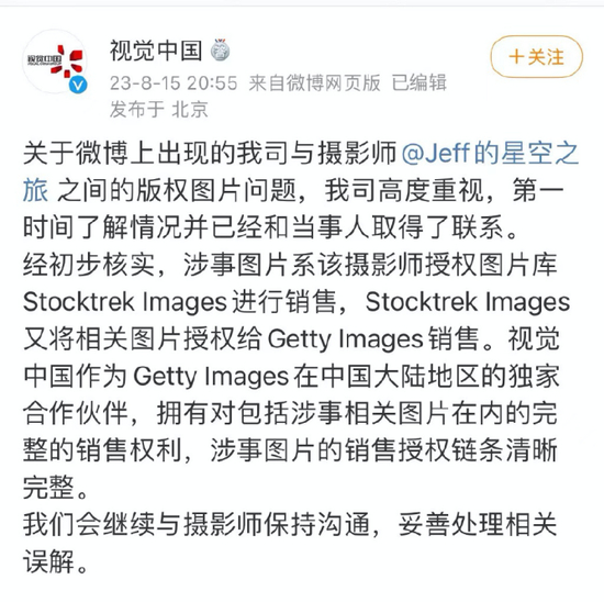 视觉中国的声明,目前评论区已关闭。(图/微博@视觉中国)
