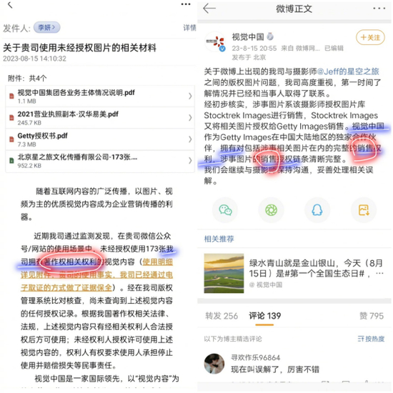 有网友发现,视觉中国在给戴建峰的邮件里声称“著作权相关权利”,而公开声明中没有这么说。(图/微博)