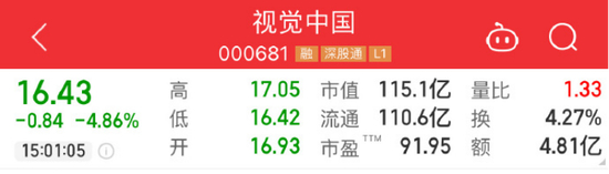 16日,视觉中国股票单日跌超4%,截至收盘,总市值为115.1亿元,单日总市值减少超5亿元。