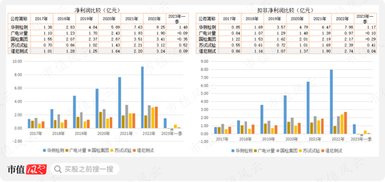 从净利润、扣非净利润看,谱尼测试的营业收入比国检集团、苏试试验高比较多,但是,谱尼测试与后二者在净利润、扣非净利润上相差不大,说明谱尼测试的盈利水平低于后二者。