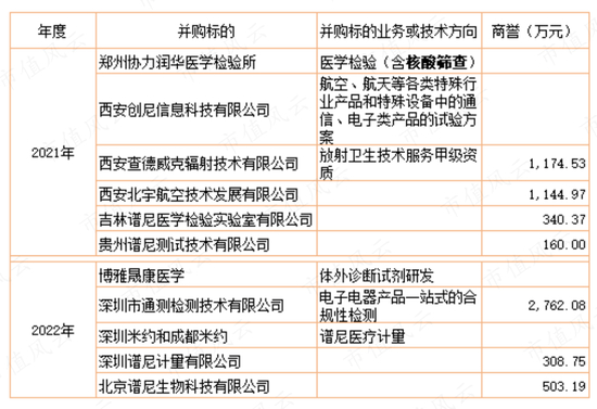需要指出的是,自上市以来,谱尼测试收购多家公司以拓展相关领域的检测业务。2021年、2022年先后收购郑州协力润华医学、深圳通测检测等11家公司,新增商誉6400万元。