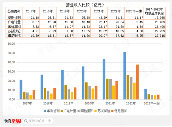 2022年,华测检测收入51.3亿元,排第一,谱尼测试以37.6亿元排第二,广电计量26亿元排第三。